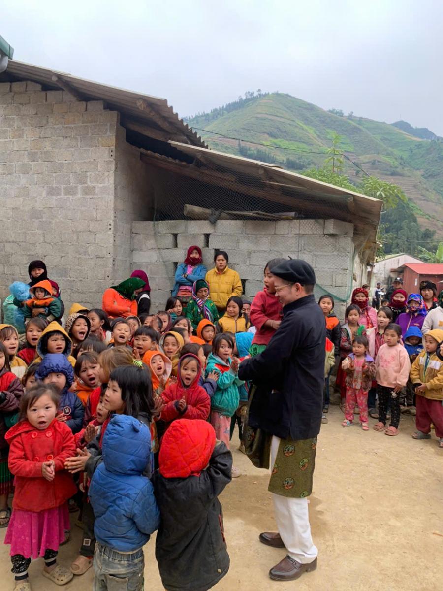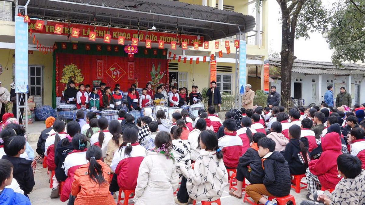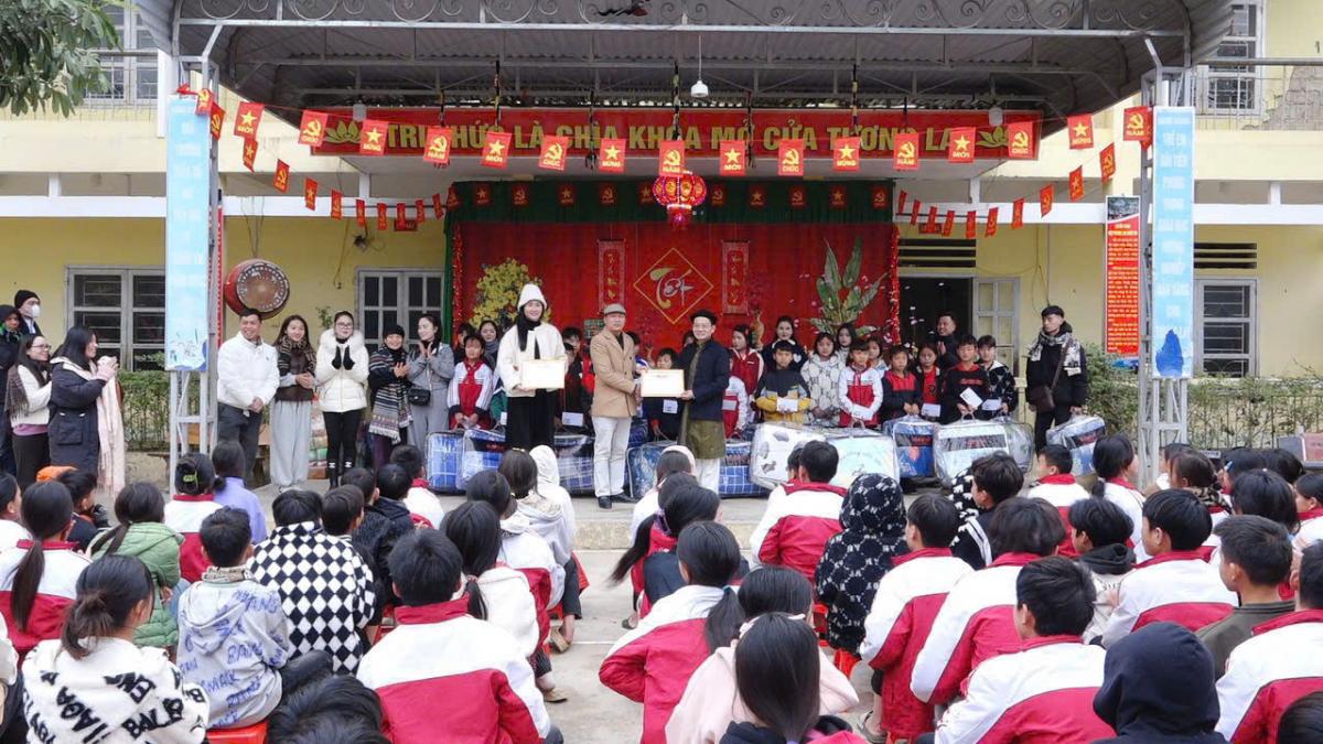 Hành trình thiện nguyện đầy ý nghĩa này, đoàn đã đến thăm và trao quà cho các em học sinh nghèo tại Trường bán trú Khâu Vai, xã Khâu Vai, huyện Mèo Vạc, tỉnh Hà Giang. Đây là một trong những điểm trường còn nhiều khó khăn, nơi các em nhỏ hằng ngày phải vượt núi băng đèo để được đến lớp, nuôi dưỡng ước mơ con chữ giữa điều kiện thiếu thốn trăm bề. Có những em học sinh phải đi bộ 17km, vượt qua bao chặng đường đồi núi để được đến lớp học chữ.